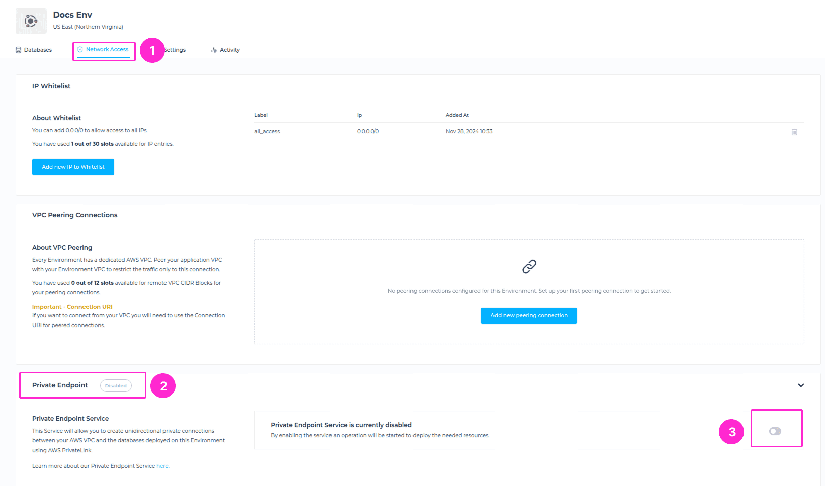 Once approved, the connection becomes active, and your databases in that Environment can now be accessed privately from your AWS VPC.