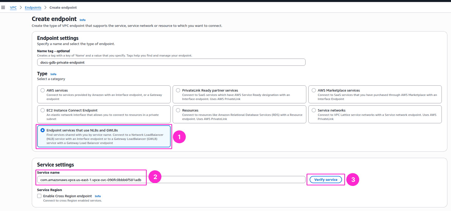 Select Endpoint services that use NLBs and GWLBs from the Type section, then paste the Service Name from GrapheneDB. Click Verify service. Service name verified should be the message displayed for you.